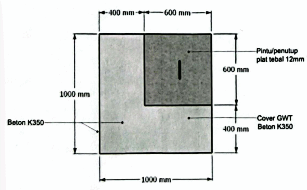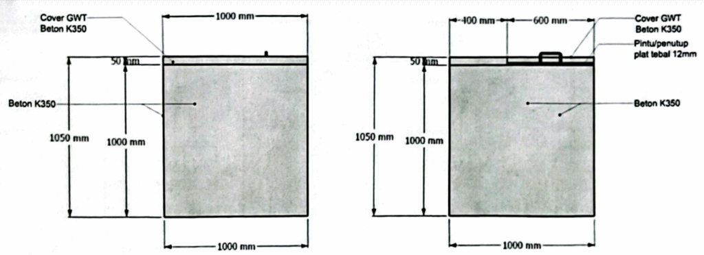 Shop drawing ini adalah rancangan teknis untuk tangki air bawah tanah (Ground Water Tank) dengan kapasitas 1 meter kubik (1 m³). Gambar kerja ini mencakup detail lengkap mengenai dimensi, spesifikasi material, dan metode instalasi tangki. Tangki ini dirancang untuk memenuhi kebutuhan penyimpanan air skala kecil dengan struktur yang kuat, tahan lama, dan hemat ruang.
