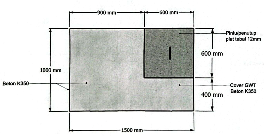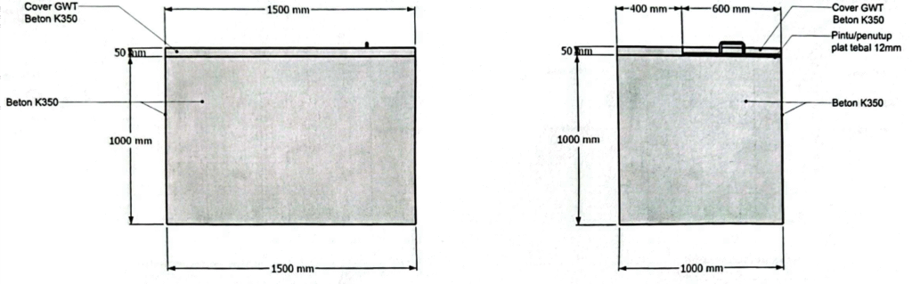 Shop drawing ini merupakan rancangan teknis untuk tangki air bawah tanah (Ground Water Tank) dengan kapasitas 1.5 meter kubik (1.500 liter). Gambar kerja ini mencakup semua detail teknis yang diperlukan, mulai dari dimensi, material, hingga metode instalasi. Tangki ini dirancang untuk memenuhi kebutuhan penyimpanan air skala sedang, dengan struktur yang kuat, tahan lama, dan efisien.